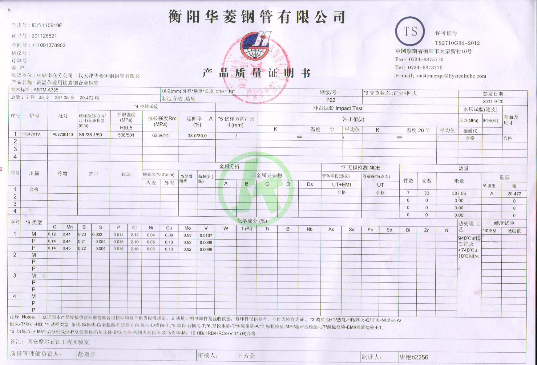 合金鋼管產品質量證明書樣本(衡陽華菱鋼管有限公司)
