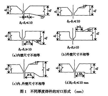 (6) 不同厚度焊件對口時,其厚度差處理方法見圖1。
