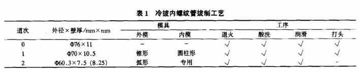 在冷拔成型過程中,管料沿拔制方向的延伸變形為主要變形,而鋼管整個橫截面卻為不均勻變形,即使內模溝槽不直接沿徑向擠壓內螺紋,管料在內螺紋處的壁厚也將參與延伸變形,薄壁部分產生附加壓應力,厚壁部分產生附加拉應力,管壁被延伸拉薄即出現拉縮現象。這就使得凸筋充填困難,實際螺紋高度小于內模溝槽深度。凸筋的拉縮量與壁厚壓下率、壁徑比、壁厚不均勻有關。為了保證螺紋高度達到標準要求,必須有足夠的減壁量。但是,減壁量受拔制應力的限制不可能很大,否則管料和內模可能被拉斷。考慮到成品壁厚為單向正偏差,實際最小壁厚按﹢10%計算,為8.25mm。根據資料提供的公式,可計算出成品前道次的鋼管壁厚約為10.2mm。為了減少拔制道次,毛管規(guī)格應盡可能接近成品規(guī)格。同時,為了消除熱軋毛管的壁厚不均勻及其他缺陷,在拔制成品前應先用圓柱形內模粗拔1道。經多次試驗,最后選用Φ76mm X 11mm的毛管,具體冷拔工藝見表1。