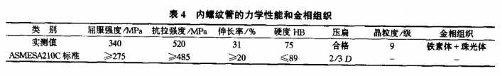 (1) 從表3可見,所生產的內螺紋管雖幾何尺寸達到標準要求,但鋼管外徑和螺紋高度均為負偏差,螺紋高度不夠是由于毛管壁厚偏薄;之后增加毛管壁厚,使拔前拔后的壁厚差保證在1.5mm以上,螺紋高度基本達到要求;鋼管外徑偏小是由于內模位置調整不當,其靠前或靠后均有影響。從表2、表4可見,其化學成分和性能完全滿足ASME要求,且性能余量較大。